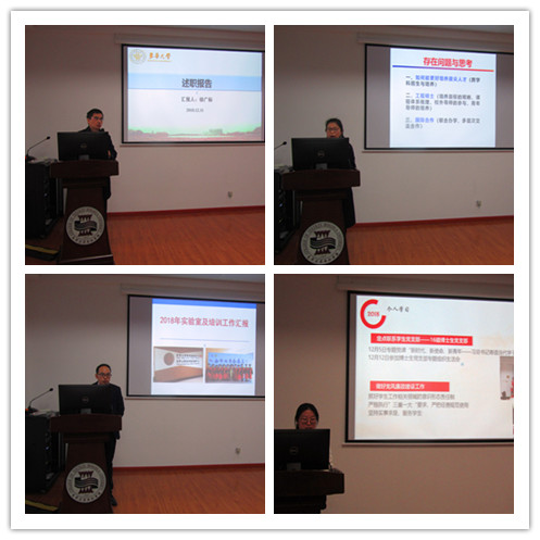 随后,副院长徐广标针对他上半年分管的研究生工作和下半年分管的本科生工作进行了述职,他主要介绍了对近期对国家各项文件阅读体会、目前完成的本科教学主要工作以及本科教育的基本思路。副院长覃小红针对其个人学习、研究生工作、外事工作等方面进行了汇报。在研究生工作方面,她详细介绍了推免生招生、研究生培养、课程建设、教材建设、学术成果、学位授予等方面的工作;在外事工作方面,她梳理了2018年学院举办的国际会议、联合培养学生数以及资助青年老师参加国际会议的情况。副院长王富军从管理制度建设、实验平台建设、仪器设备管理、实验室安全工作、检测培训工作、学院文化建设、教学科研工作等方面进行了汇报,并对个人教学科研工作进行了介绍。党委副书记刘雯玮从个人学习、工作内容两个方面进行了述职。她着重介绍了学院在大学生党建工作、学风建设、科技创新、新媒体宣传方面取得的成绩,并对学院2018年学生就业情况进行了详细的汇报。