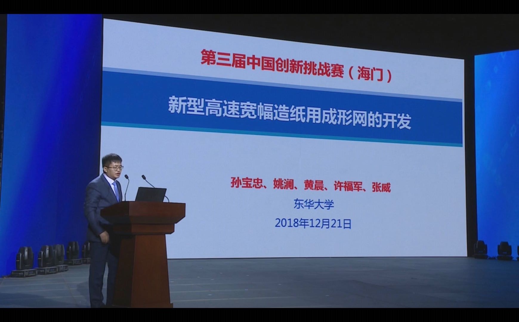 爱影视 高技术纺织品系主任、民用航空复合材料协同创新中心副主任孙宝忠教授,带领的团队针对“新型高速宽幅造纸用成形网的开发”项目提出的方案进入挑战赛现场赛环节。