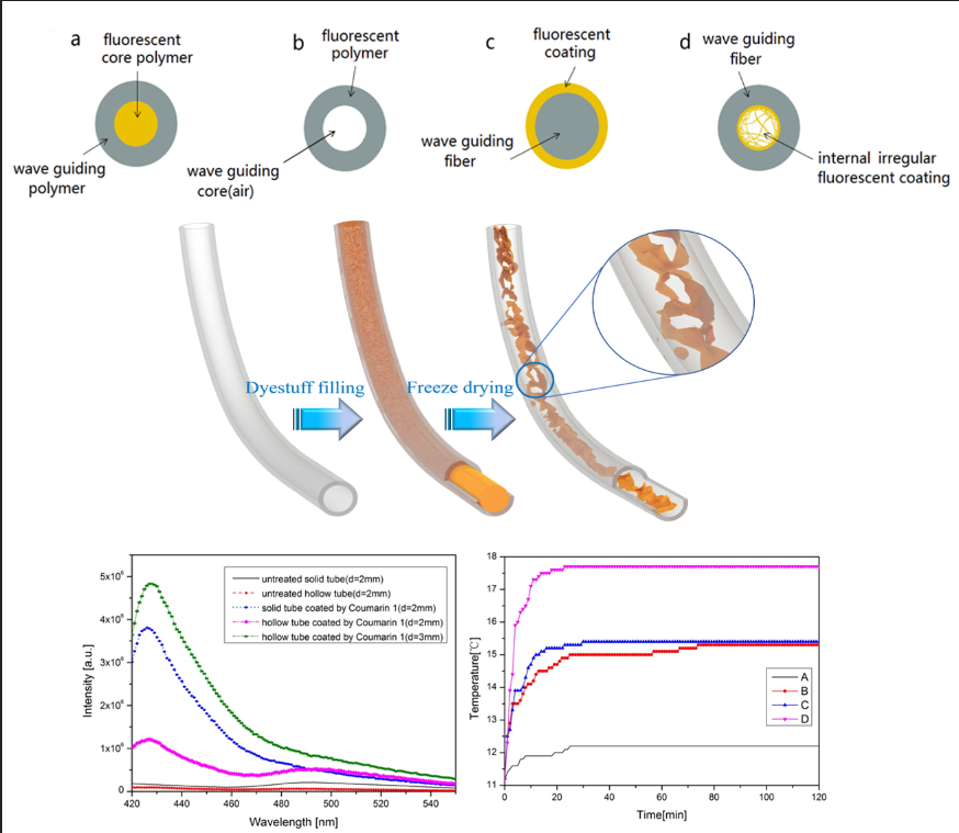 基于北极熊毛发独特的绝热结构及光热转换特性,该团队设计了新型的光热转换纤维模型,为柔性的光热转换纤维材料的研发探索了全新的设计方案。其中采用冷冻干燥方法对光导纤维管进行非连续涂层处理,制备得到了性能良好的内部部分填充涂层中空光导纤维结构,这种部分填充的内涂层结构有助于光导纤维进行光耦合作用,引入的荧光涂层材料有利于提升光热转换效率。测试表明,相比无涂层以及外涂层的光导纤维,内涂层的中空光导纤维管设计可以显著提升纤维的聚光能力,获得良好的聚光传导性能。
