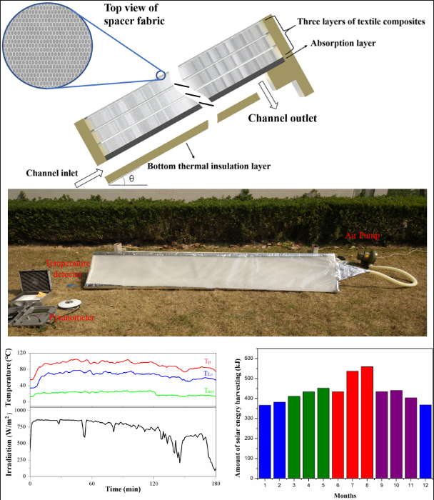 该团队还在纺织基太阳能空气集热器热效能理论分析研究的基础上,构建了计算纺织基太阳能空气集热器组热效能的数学模型,并模拟计算了纺织基太阳能空气集热器在不同结构参数、入口参数、光学参数和环境参数的情况下,集热器的出口温度、吸热层温度、有用能、效率因子以及热迁移因子等性能指标。并应用所建立的数学模型,制备了初期产品装置,进行了室外太阳能集热试验,验证了所设计系统的有效性,并验证了相关模拟结果的正确性。