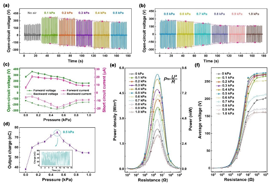 针对这种新型结构的能源器件,研究人员系统地研究了其在不同内部气压下的电输出性能,证明了在内压为0.5kpa时,该器件能产生最大输出。同时,还发现器件内部的空气能平衡外力的分布,使输出性能的正反向信号均匀化。此外,还比较和分析了不同作用力、频率、空气相对湿度、温度等外界因素对器件电输出性能的影响,进一步验证了其环境适应性。