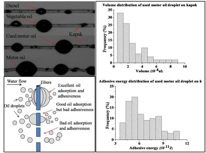 Water pollution caused by oil spillages is one of the major environmental problems today. The commonly used synthetic materials for oil sorption are non-renewable resources, which triggers an intensive interest in various natural sorbents. Kapok fiber is a naturally hydrophobic and oleophilic plant fiber which is attracting various academic attentions for its unique hollow lumen structure. Studies on the oil sorption of kapok fibers began with the past decade. Several researchers from Nanyang Technological University, Universiti Teknologi Petronas and Indian Institute of Technology, particularly as well as Prof. Aiqin Wang in Chinese Academy of Sciences and Prof. Guangbiao Xu in Donghua University, have reported oil removalby kapok fibers, and found that oil adsorption and adhesiveness of the fiber are two critical aspects closely related to its oil-to-water separating efficiency. However, the common angle measurement evaluating wettability and adhesiveness of material to liquid by contact angle and roll-off angle is not suitable for oils wetting on surfaces where instant spread of oils happens.