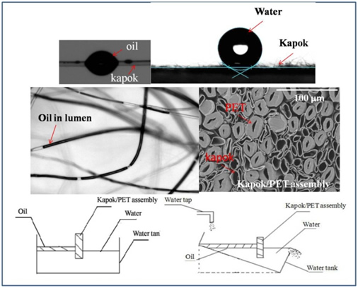 In recent years, the increasingly serious oil pollution caused by oil spillages has aroused a vast concern all over the world. To deal with those of oil polluted water, mechanical extracting oil from water by sorption materials is widely used. The commonly used synthetic sorbents are usually made from oil byproducts. Some problems like complicated preparation process, unstable oil sorption, non-degradable property etc trigger an intensive interest in natural sorbents. Kapok fiber is a naturally hydrophobic and oleophilic plant fiber which is attracting various academic attentions for its unique hollow lumen structure. As a natural sorbent for oil sorption, the excellent oil sorption capacity of kapok fibers were reported by researchers from Nanyang Technological University, Universiti Teknologi Petronas and Indian Institute of Technology, as well as Prof. Aiqin Wang in Chinese Academy of Sciences and Prof. Guangbiao Xu in Donghua University.