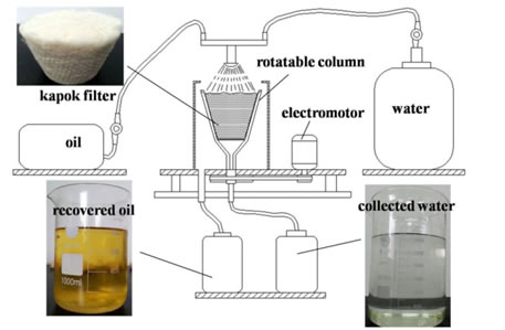 The researchers in Prof. Guangbiao Xu’ group investigated the adsorption and adhesiveness of oils on single kapok and characterized size and adhesive energy distribution of adsorbed oil droplets on fiber based on Carroll’s theory of droplet morphology. Based on the research, they regulate the porous structure of oil filters consisting of kapok fibers via air-laying-bonding method and fabricated the highly porous structured kapok filters which show high capacity of oil absorption and retention. In contrast to the conventional filter column which is a fix cylinder, the Guangbiao Xu’ group develop a depth filtrating system with the rotatable and taper-shaped filter column. Therefore, the oil removed from wastewater was then recovered from the oil-loaded filter by rotating the filter column, and the resulted filter was reused. The result of this research presents key advance in the design of oily filtration system and the fabrication of fibrous oil sorption materials. The technique is believed to present important application in cleanup and recovery of future oil spillages.